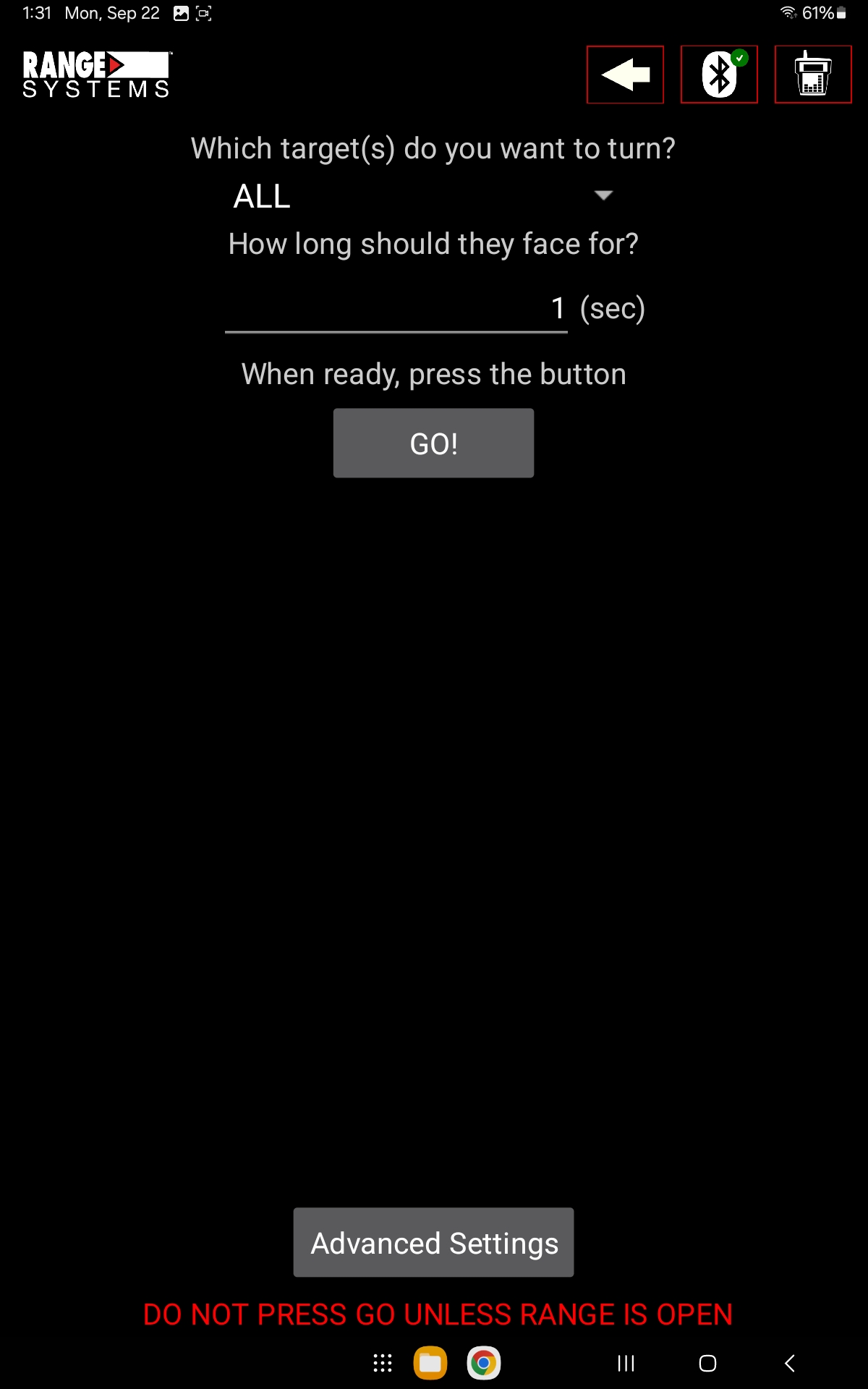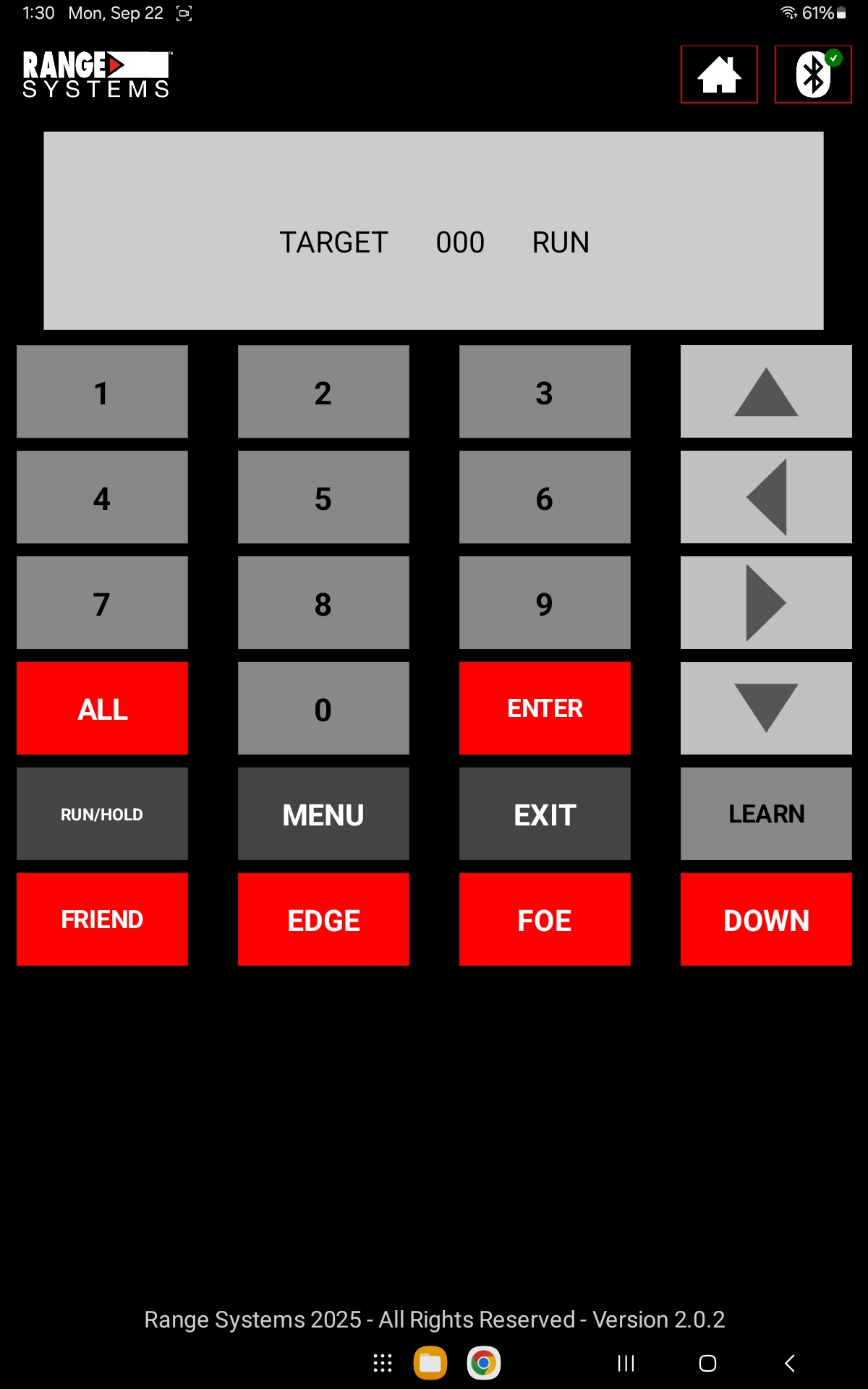 The Range Systems Turning Target Android Software, when paired via Bluetooth with the PRO-TAB Wireless Handheld Controller, provides seamless wireless control and programming of Range Systems’ Pro-SIT and Pro-Turn Series target systems.